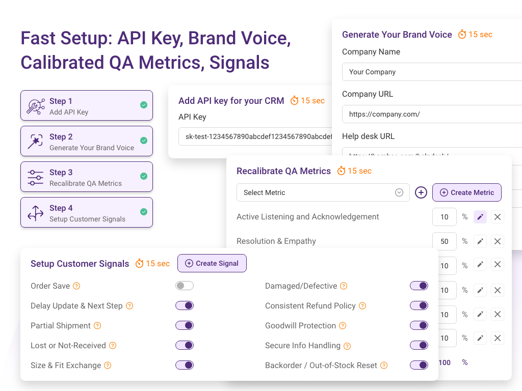 - Brand-aligned automated QA (empathy, clarity, resolution, compliance)
