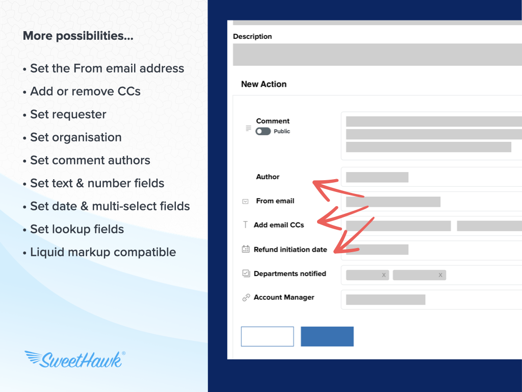 • Liquid markup compatible - Use Zendesk placeholders & liquid functionality, to populate ticket fields.