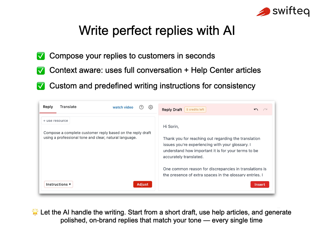 Clear, Consistent Communication: AI guided replies follow your tone, terminology, and glossary rules, ensuring every message matches your brand.