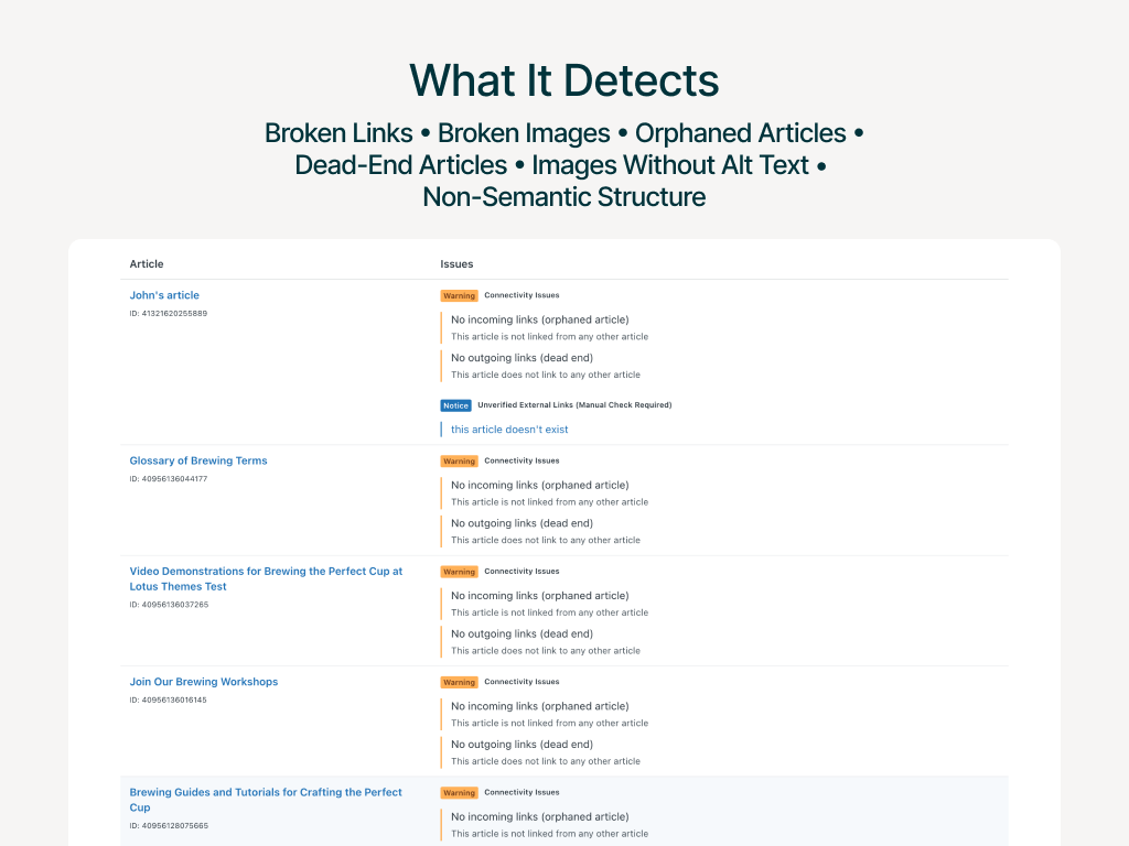 Your Help Center is often the first place customers go for answers. But over time, articles accumulate broken links, missing images, and orphaned content. These issues frustrate customers and erode trust in your support resources.