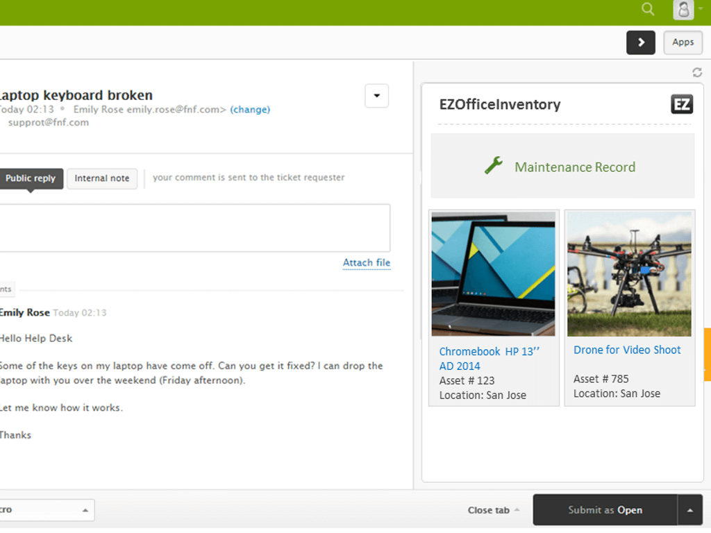 • An employee requests repairs for a broken laptop and reserves a loaner during the service. EZOfficeInventory manages asset-related details while Zendesk manages the ticket workflow. Alerts are generated at the expected date of service completion for outstanding tickets and overdue reservations.