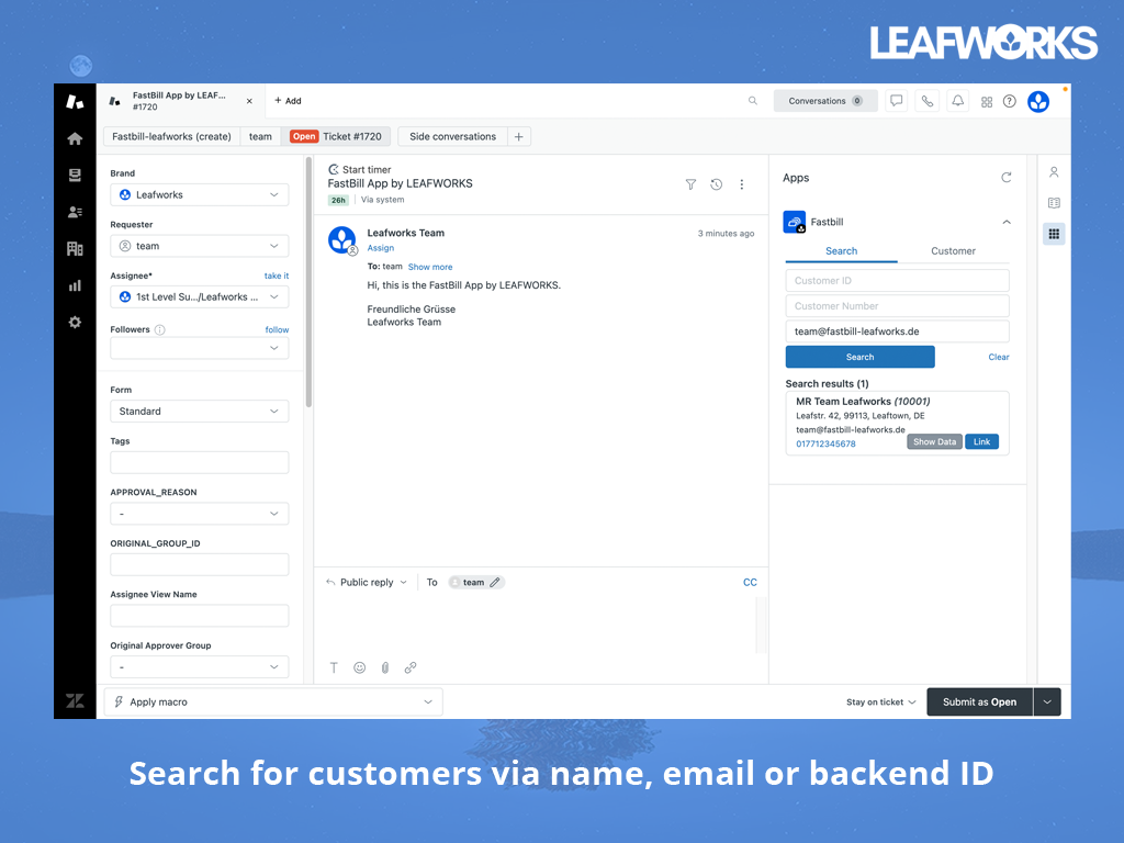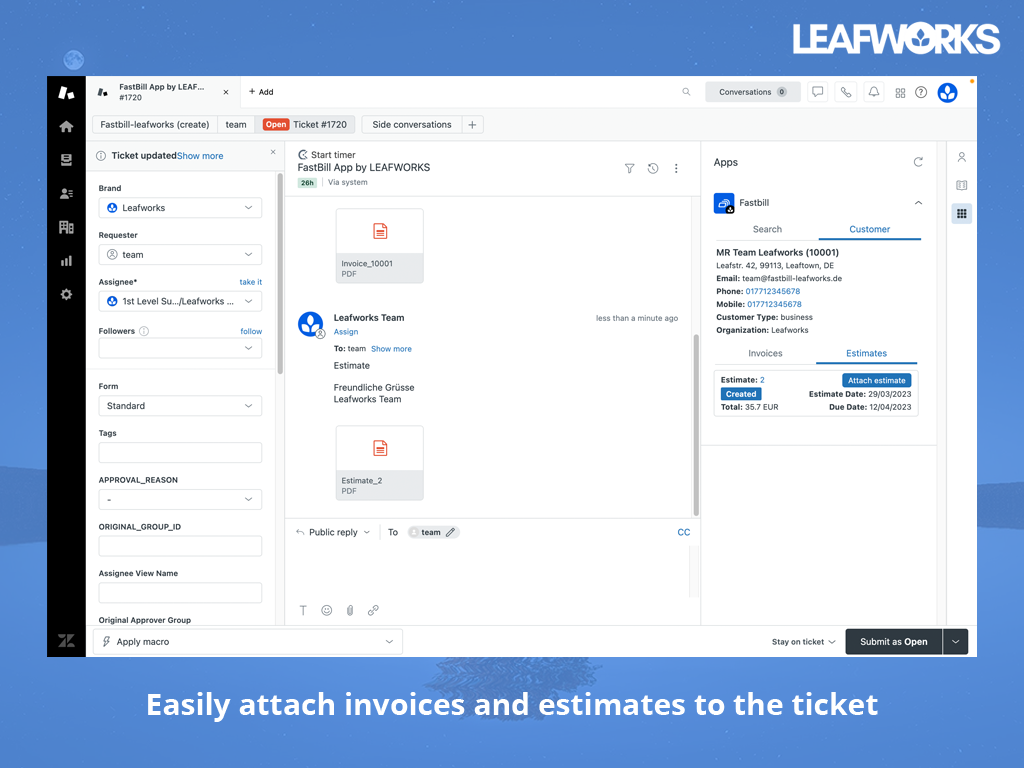 In order to work with tickets in Zendesk efficiently, it is important to have all necessary information in one place. Short and simple processes allow for fast response times based on relevant data. The FastBill app from Leafworks gives you a plugin to keep an overview of your customers’ contact info, invoices and estimates.